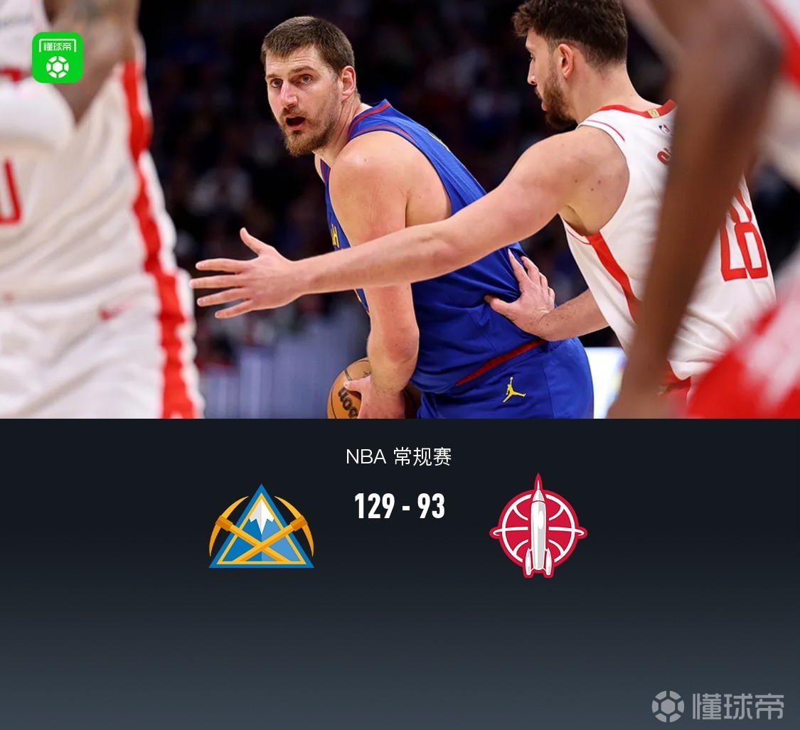 北京时间3月12日NBA 常规赛,丹佛掘金对阵休斯顿火箭。上半场双方防守拉锯战,半场掘金53-47火箭,第三节掘金轰出40-22领先至24分,最终掘金129-93火箭。其中火箭全场三分手感极为糟糕33投4中。